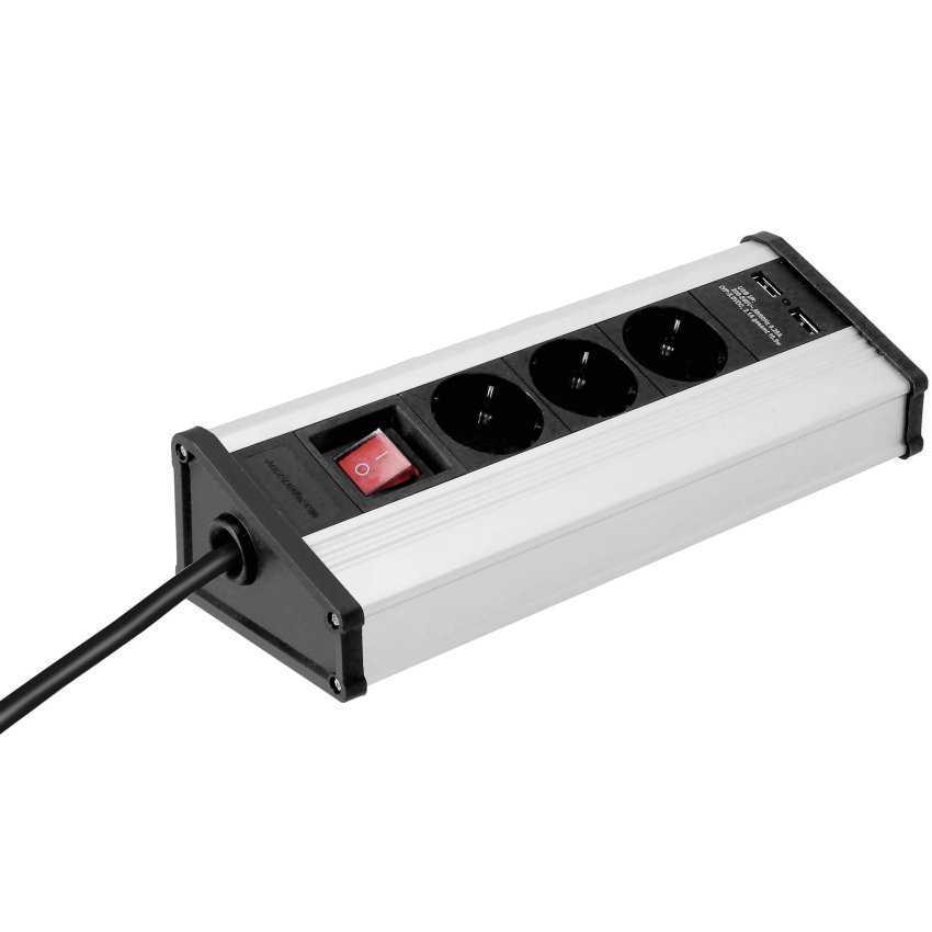 Grenkontakt från tyska Adam Hall med 3st Schuko 230V uttag samt 2st USB-uttag. Kabellängd: 1,4 meter.