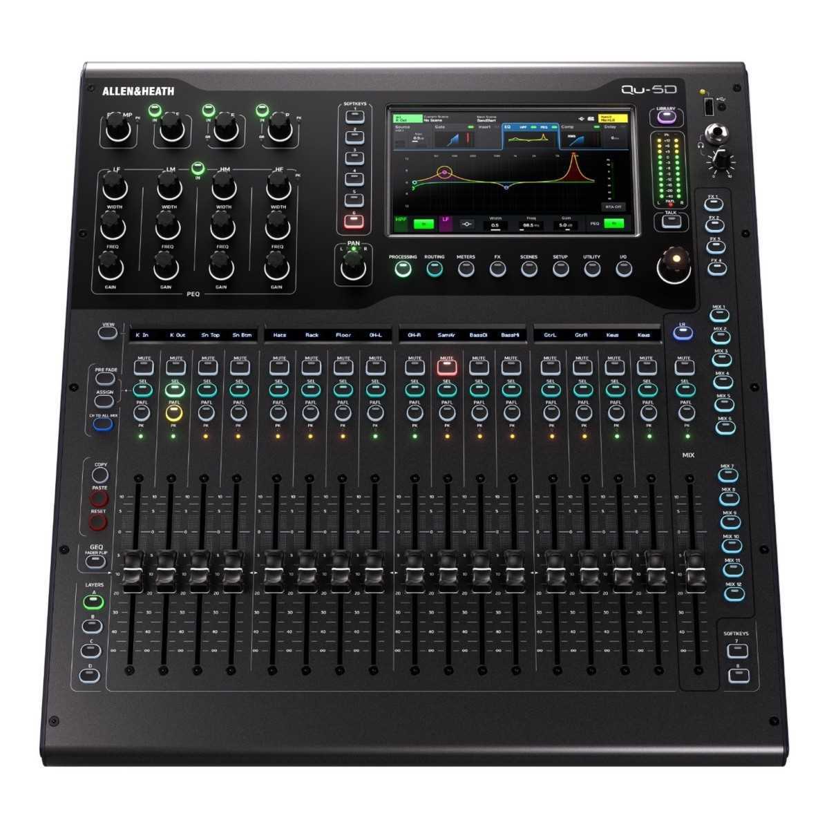 Qu5 D bygger vidare på den populära Qu-16-formfaktorn men adderar Allen & Heaths kraftfulla XCVI processing, nya effektmotorer och Everything I/O-anslutning. D-versionen är dessutom utrustad med Dante. Den har också en större kapacitiv pekskärm, kanallistdisplayer, anpassningsbara lager och extra SoftKeys. 16 XLR ingångar, 12 XLR utgångar,  17x 100mm motoriserade reglar, 12x mixar och mycket mer