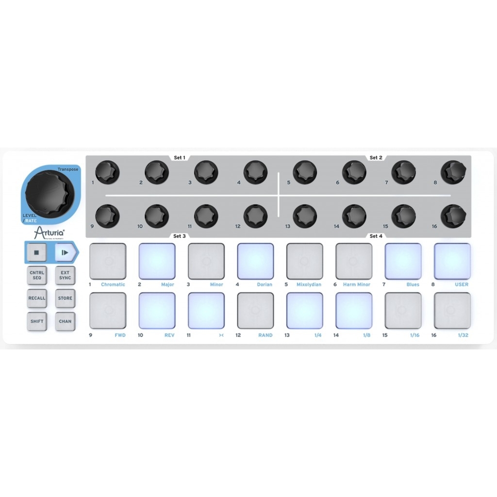 Kombinerad 16- stegs step sequencer och MIDI-kontroller från Arturia utrustad med 16 anslags- och aftertouchkänsliga pads samt 16 programmerbara rattar.