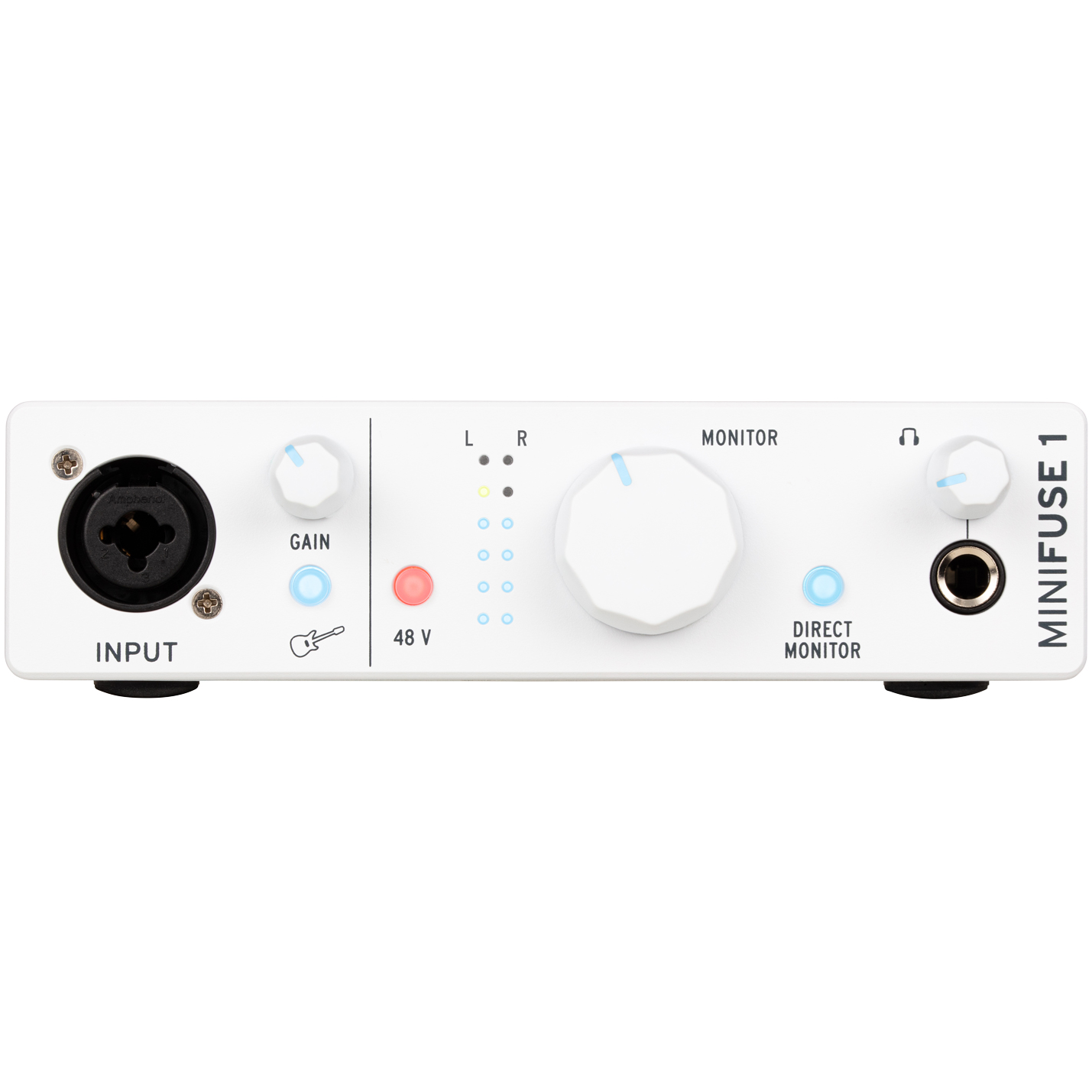 MiniFuse 1, här i vitt utförande, är det mest kompakta externa USB-ljudkortet i Arturias MiniFuse-serie. Kortet har en kombinerad ingång för mikrofon- (med 48V fantommatning), instrument- (Hi-Z) eller linjesignal, två utgångar för högtalare, en hörlurutgång samt en inbyggd USB-hubb.
