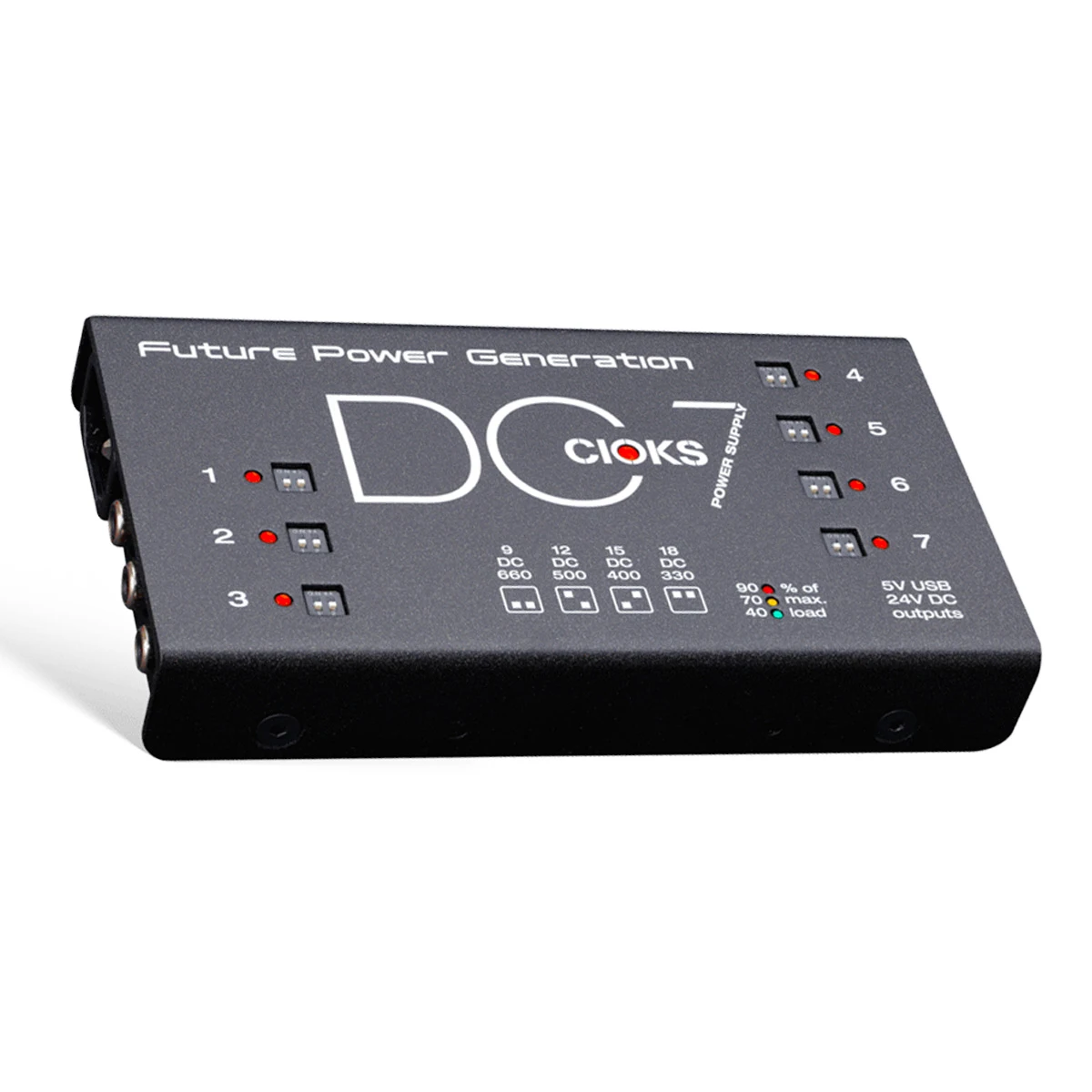 CIOKS DC7 har 7 isolerade DC-uttag för effektpedaler, var och en med fyra valbara spänningar. Varje uttag kan leverera 6 W, vilket motsvarar 660 mA ström vid 9 V. Dessutom har DC7 ett 5 V USB-uttag och ett extra 24 V-uttag. DC7 kan utökas med CIOKS 4 Expander, CIOKS 8 Expander och Crux för fler isolerade uttag och ännu större flexibilitet. I kombination med det stora utbudet av CIOKS Flex-kablar som ingår är vi övertygade om att detta är den mest flexibla och brusfria lösningen på marknaden för strömförsörjning av pedalbord med en mängd olika pedaler.