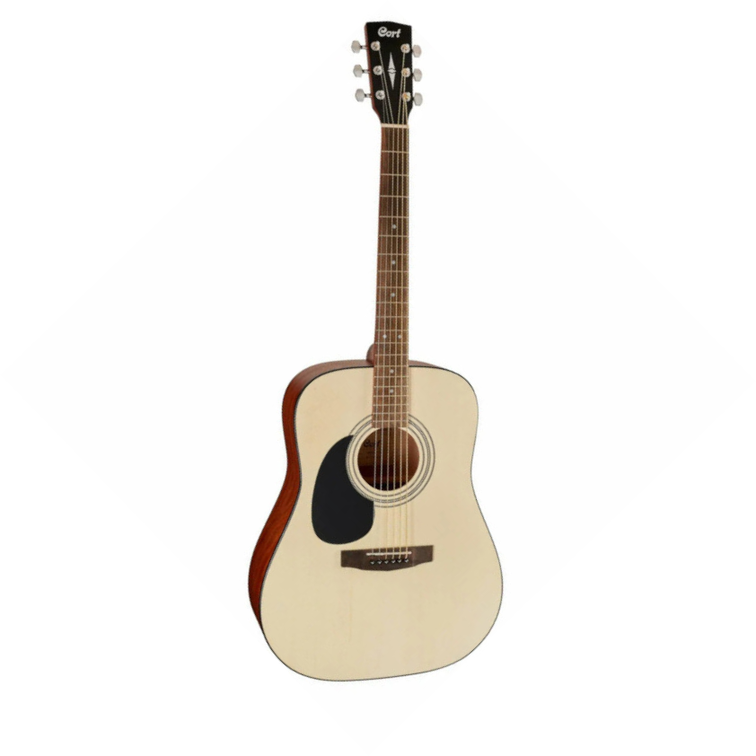 AD810 är en vänsterhänt akustisk dreadnought från Cort med sidor och botten i mahogny, topp i gran, hals i mahogny samt greppbräda i merbau.