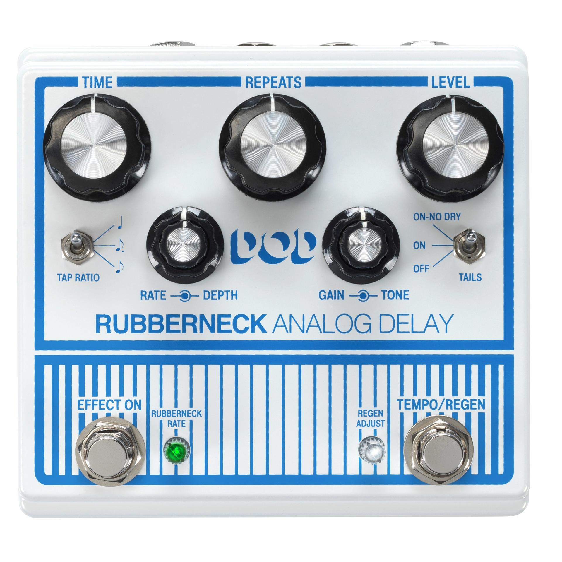 The new DOD Rubberneck Analog Delay has double the features with the cool new double-wide chassis. The Rubberneck boasts over a second of warm and musical 100% analog repeats you crave, along with tap-tempo, subdivisions, and tails. Double concentric knobs give you independent control of the Modulation Rate and Depth as well as Gain and Tone of the delay.