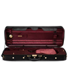 Träskal, italiensk stil, paisleymönstrat sidentyg, instrumentformad sammetsinredning, tre tillbehörsfack, fyra stråkhållare, hygrometer.