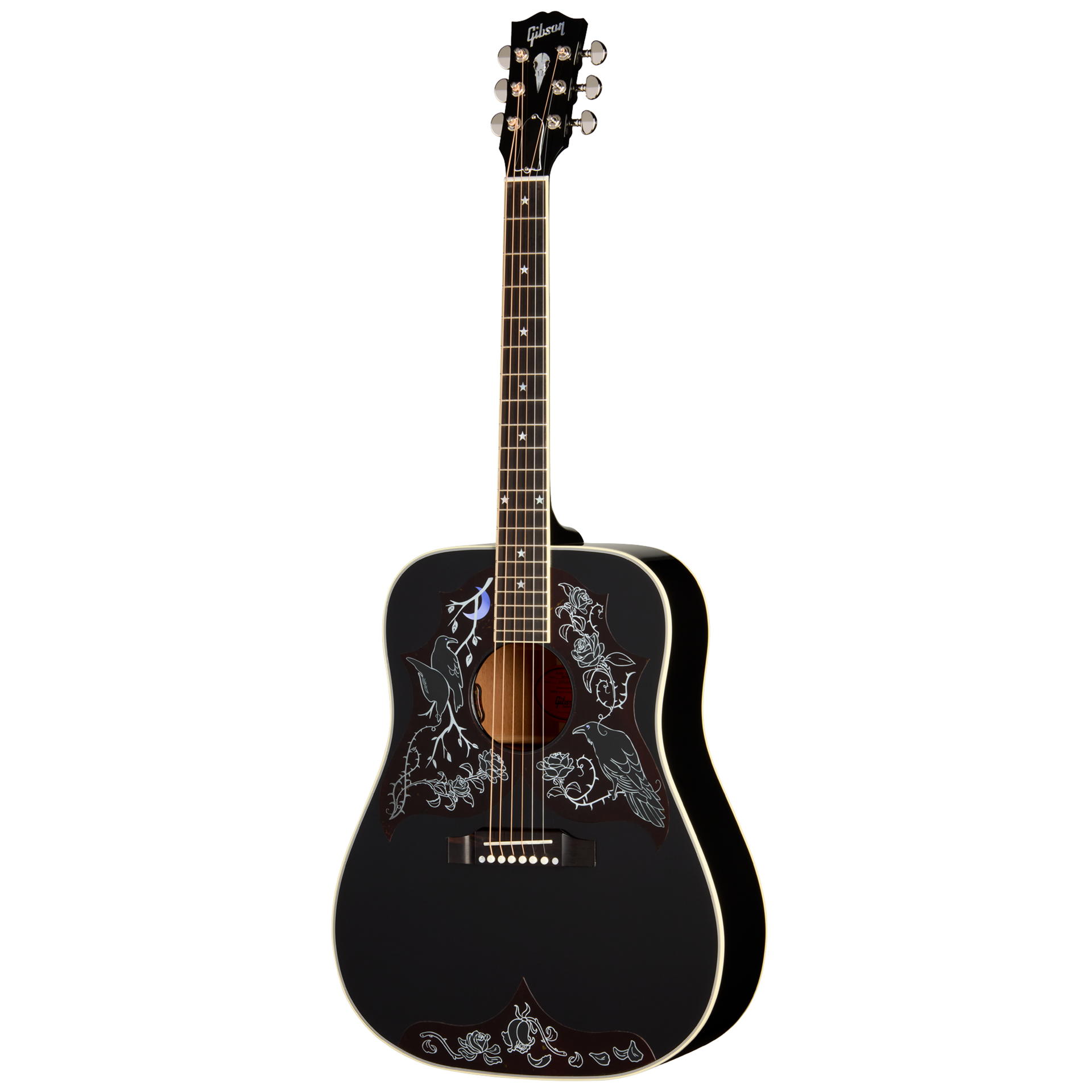 Kirk Hammett, den legendariska leadgitarristen i Metallica, samarbetade med luthiers på Gibson Custom för att skapa Gibson Custom Kirk Hammett Raven, ett distinkt tillskott till den berömda Gibson Custom-serien av akustiska gitarrer. Kirk Hammett Raven är den specialdesignade motsatsen till den legendariska Gibson Hummingbird T™ . Liksom Hummingbird har den en fyrkantig kropp med mahognybotten och -sidor i kombination med en Sitka-granlock som är förstärkt med traditionell, skulpterad Advanced X-bracing, vilket ger den klassiska akustiska gitarrklangen som har glatt musiker och fans i årtionden. Mahognyhalsen har en rund profil och är toppad med en bunden ebenholtsgreppbräda, utrustad med 20 standardband och prydd med pärlemorsstjärninläggningar. Greppbrädan har också en radie på 16 tum, vilket gör det lättare att spela snabba och flytande solon. Huvudet är utrustat med Grover® Rotomatic®-stämskruvar, och stämskruvarna, den kompenserade sadeln och sadeln är alla TUSQ®, vilket garanterar smidig och stabil stämning. Gibson-logotypen och en distinkt inläggning av en korpskalle finns också på huvudstocken, båda inlagda i pärlemor. Denna gitarr i begränsad upplaga speglar också Gibsons berömda modeller med vilda djurstema med sina specialtillverkade, mycket utsmyckade dubbelpickguards med korptema och korpinspirerade tailpiece-detaljer.