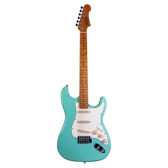 Traditionell S-shape från Jet Guitars med kropp i basswood, hals i kandensisk rostad lönn, greppbräda i rostad lönn, kromad hardware, vitt plektrumskydd samt 3st single-coil pickuper med 5-lägesswitch. Färg: Sea Foam Green