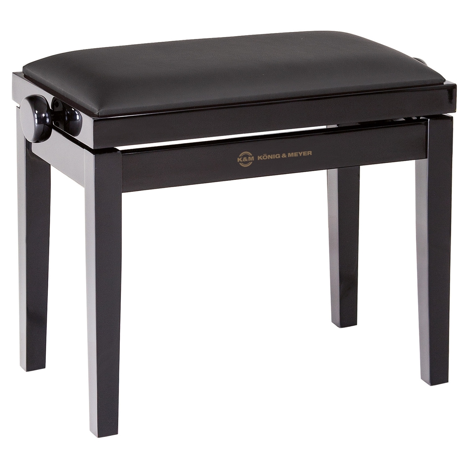 Tysktillverkad pianopall av traditionell möbeltyp. Tillverkad i solid bok med fyra lager polyesterlack. Steglöst justerbar höjd mellan 46 och 55 cm. Dyna i mjukt konstgjort skinn. Färg: polerad svart.
