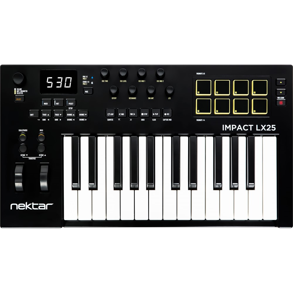 Nektar Impact LX25 mk3 är en mångsidig och kompakt MIDI-klaviatur med 25 anslagskänsliga synth-action-tangenter, utformad för att ge maximal kontroll i ett smidigt format. Den nya, förbättrade tangentmekaniken erbjuder en mer uttrycksfull spelkänsla som passar både nybörjare och mer erfarna musiker. Klaviaturen är utrustad med 8 programmerbara rattar, 8 velocity-känsliga pads med LED-belysning, transportkontroller och en stor "Data/Select"-ratt – allt för att ge dig direkt tillgång till dina favoritfunktioner i DAW-program som Logic, Cubase, Ableton Live, FL Studio med flera. Nektars kraftfulla DAW-integration gör att du slipper tidsödande inställningar – allt fungerar smidigt direkt ur lådan. Impact LX25 mk3 är även NKS-kompatibel, vilket innebär att du kan styra kompatibla plug-ins med fullständig parameterkontroll och visuell feedback. Dessutom finns en full oktavknapp, pitchbend- och modulationshjul samt möjlighet att spara och ladda anpassade presets. Sammanfattningsvis är detta ett utmärkt val för producenter, musiker och låtskrivare som söker en portabel men funktionsrik MIDI-kontroller med både djup och flexibilitet. Perfekt för både studion och det mobila musikskapandet.