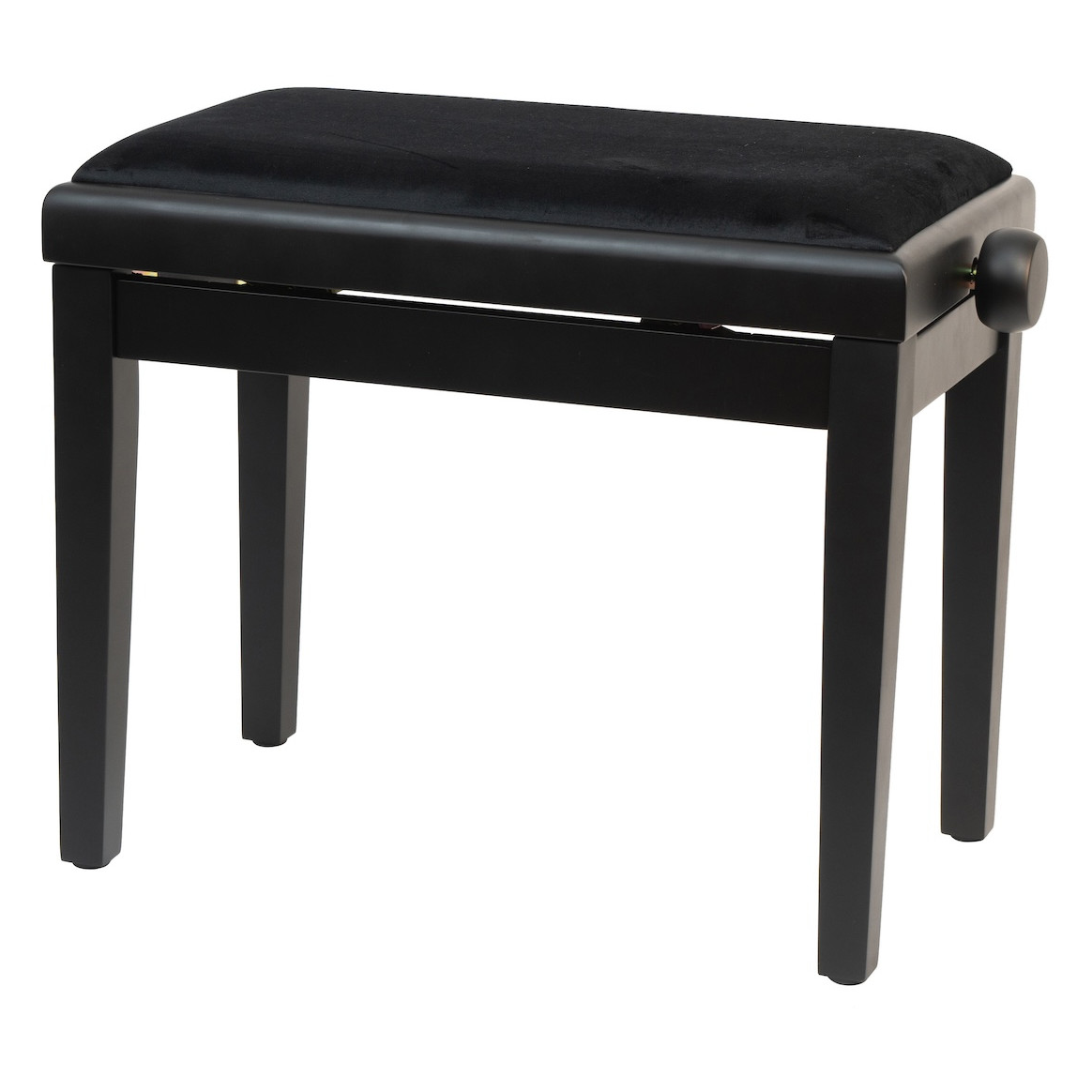 Elegant pianopall av möbeltyp, steglöst höj- och sänkbar med två skruvrattar. Svart sits i tyg.