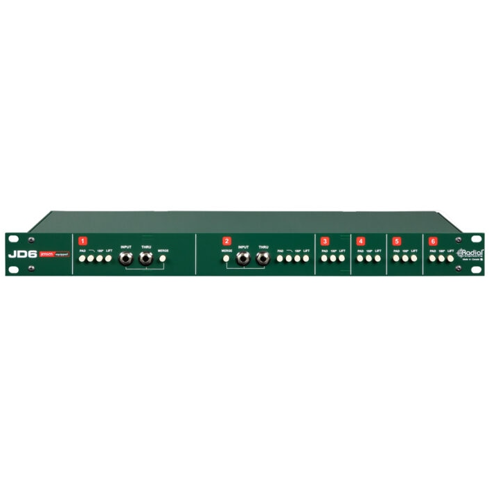 JD6, som härstammar från industristandarden Radial JDI™, innehåller sex premium Jensen-transformatorer med extra RF-filtrering för att säkerställa optimal signalöverföring med minimalt brus, fasförskjutning eller distorsion. De klarar också extrema signalnivåer, vilket gör JD6 särskilt effektiv vid hantering av aktiva enheter med hög uteffekt, t.ex. digitala pianon som ofta överbelastar de flesta direktlådor eller förförstärkare. Varje JD6-kanal är utrustad med en bakmonterad ¼” instrumentingång och genomgång för artistens förstärkare samt en balanserad XLR-utgång för matning av mixerbordet, medan kanalerna 1 och 2 har frontpanelkontakter som växlar ingång så snart en kabel sätts i för ökad effektivitet i studion