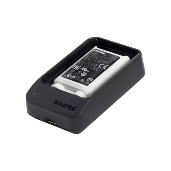 USB-batteriladdare. Kan drivas från AC-eliminator eller USB-port för laddning av Shure SB903 litiumjonbatteri. SB903 används endast med SLX-D digitala trådlösa sändare.